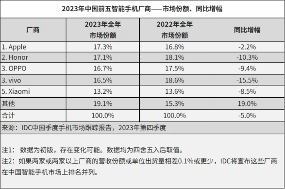 从市场份额来看,魅族手机的状况也不容乐观,2023年,国内手机市场Top5中没有魅族的身影,依然被归于“其他”行列,而苹果、荣耀、OPPO、vivo、小米的市场份额合计已经超过80%。