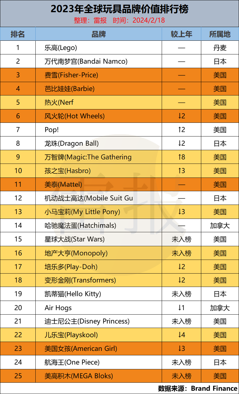 其中,孩之宝占了8个席位,包括孩之宝及旗下热火、万智牌、小马宝莉、培乐多、变形金刚、儿乐宝、地产大亨,其中热火占据第五、万智牌上升八位来到第九名;美泰占了6个席位,费雪、芭比娃娃稳居第三、第四,还有美泰、风火轮、美国女孩、美高积木。