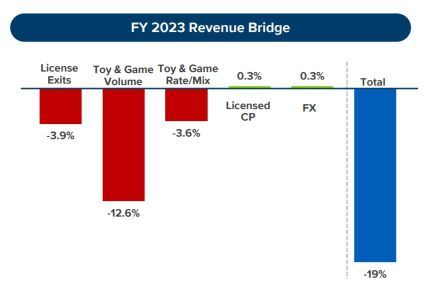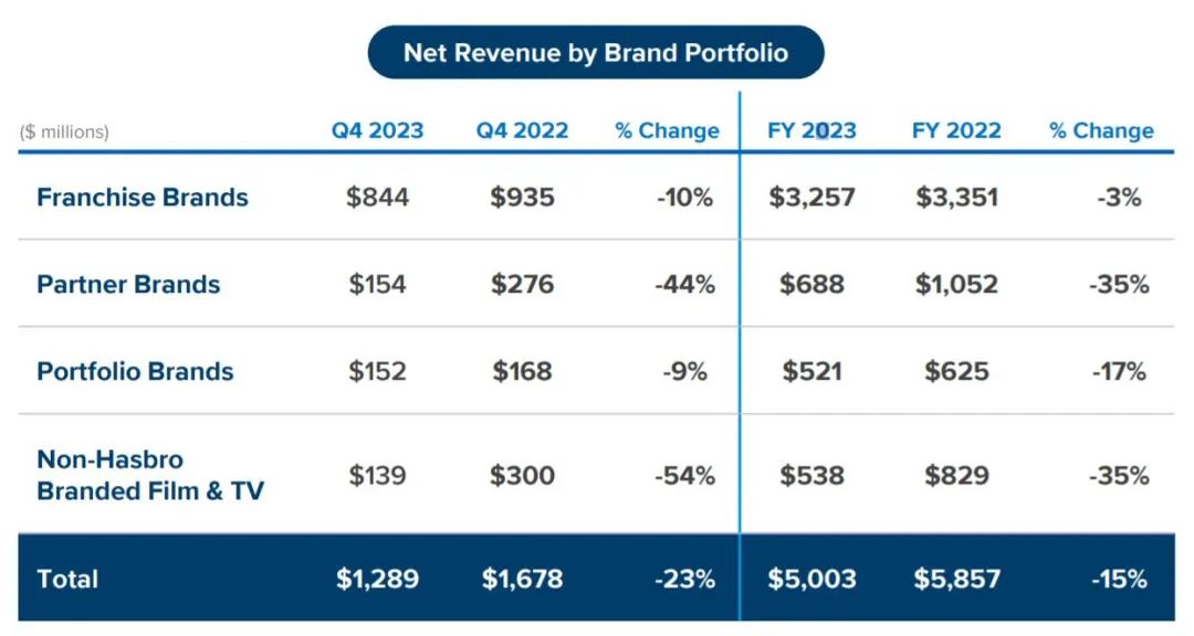 从品牌组合的角度,自2023年Q1起,孩之宝目前将其旗下业务划分为【特许经营品牌】、【合作伙伴品牌】、【投资组合品牌】以及【非孩之宝影视品牌】四个部分。2023年,这四大品牌组合的收入出现了全线下滑,分别下滑了3%、35%、17%、35%。