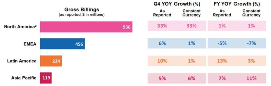 分不同地区来看,北美、欧洲、亚太及拉美四大分区2023年分别实现净收入16.49亿美元、6.69亿美元、2.56亿美元以及3.11亿美元。四大地区收入均出现不同程度的全线下滑,分别下滑了20%、26%、13%、1%。