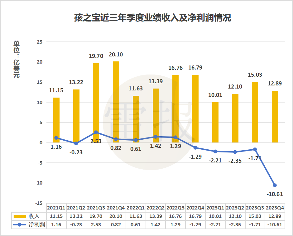 2023年Q4,孩之宝实现营收12.889亿美元(约合人民币92.76亿元);实现净亏损10.608亿美元(约合76.36亿元),第四季度出现了巨额亏损。