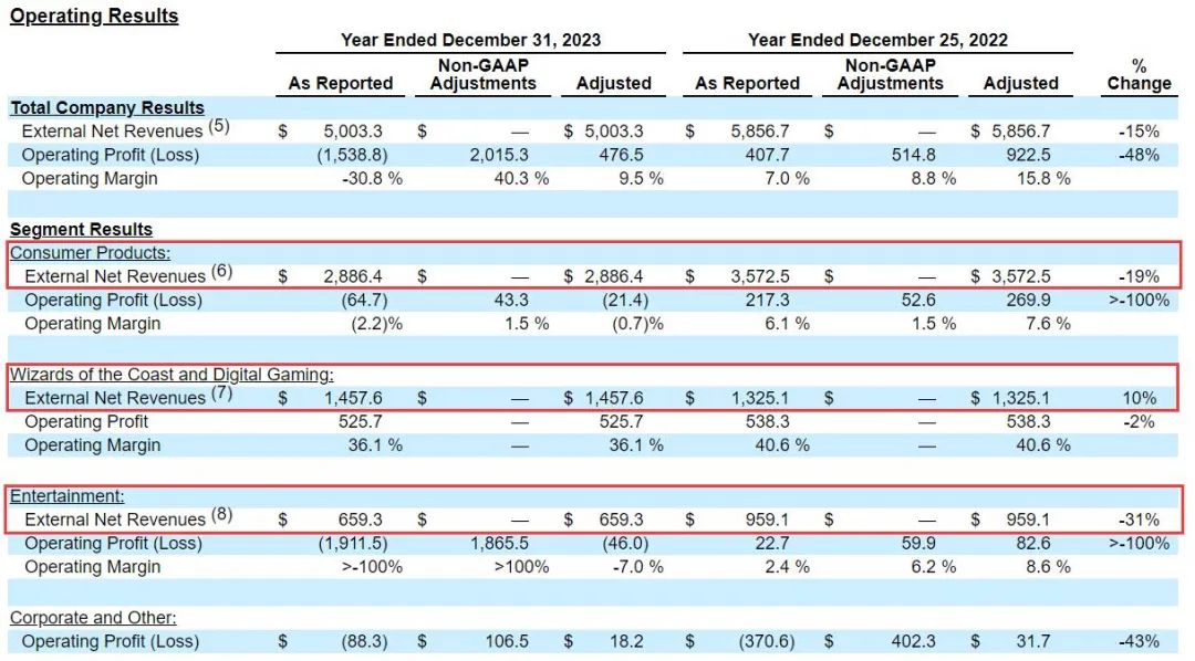 孩之宝旗下业务可分为三个部门,分别为【消费品】、【威世智与数字游戏】以及【娱乐】。据悉,孩之宝公司全年收入下降了15%,其中【威世智与数字游戏】(+10%)的增长被【消费品】(-19%)和【娱乐】(-31%)部门的下降所抵消。