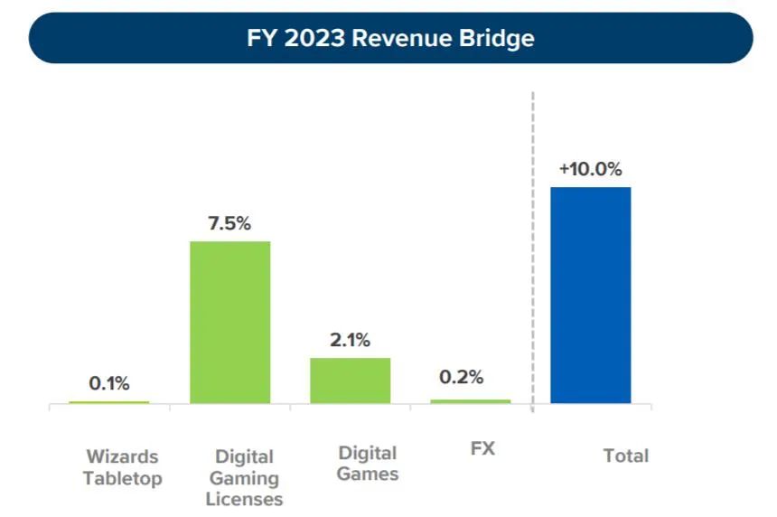 2023年全年,该部门的净收入为14.58亿美元,同比增长10%。主要是因为《博德之门3》以及《地产大亨》带来的授权数字游戏收入的大幅增长。2023年,孩之宝授权数字游戏收入3.58亿美元,同比大幅增长49%。
