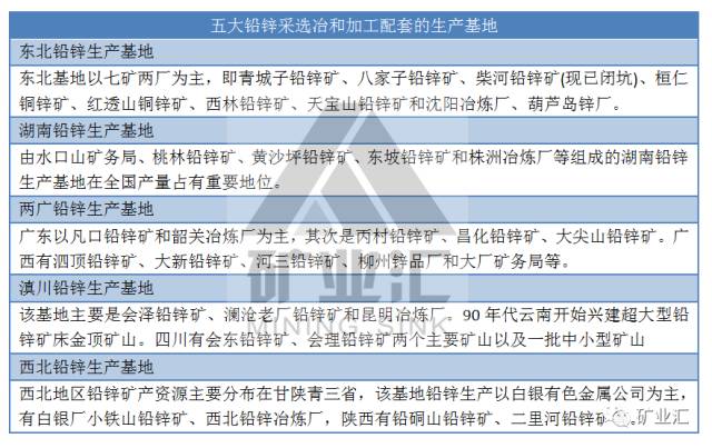 除上述五大铅锌生产基地外,内蒙古梧桐花铅锌矿、江西有银山铅锌矿、贵州有赫章铅锌矿等。均是我国主要铅锌精矿生产地区。