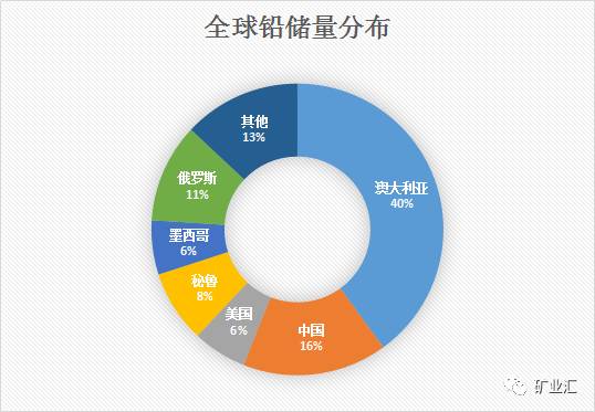 根据美国地址调查局2015年发布数据显示,全球铅储量约为8700万吨,主要分布于澳大利亚、中国、俄罗斯、美国、秘鲁和墨西哥,上述6国储量占全世界的87%,其中澳大利亚储量为3500万吨,占全球储量的40%,其次为中国,储量为1400万吨,占全球总储量16%。