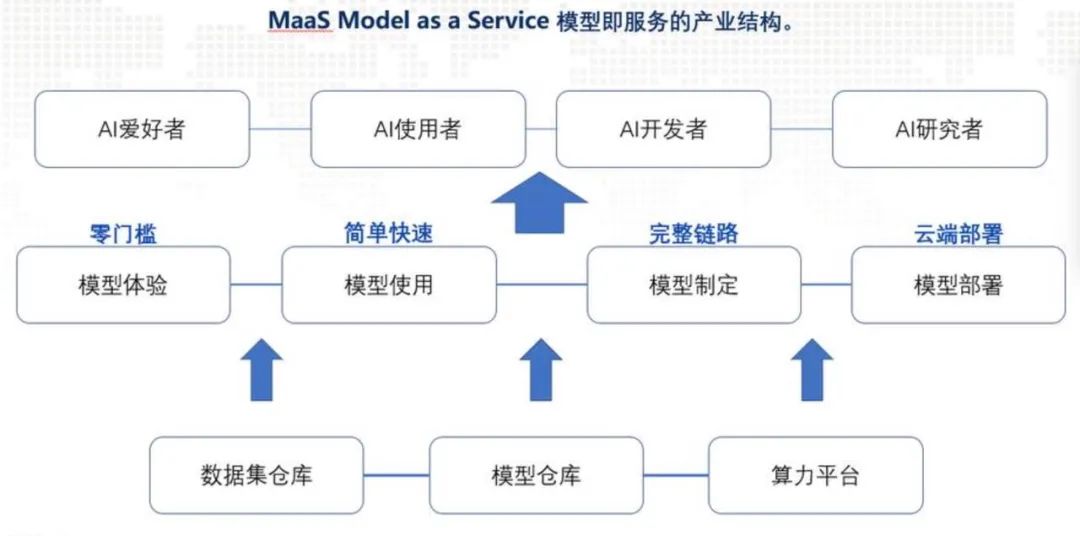 具体来看,MaaS简化了AI的使用流程,无需用户拥有深厚的AI技术和大量计算资源来训练模型,降低了企业和个人应用AI技术的难度和成本。MaaS还提供标准化接口,用户可以根据自身需求灵活调用不同的模型服务,节省了大量的研发时间和资金投入。