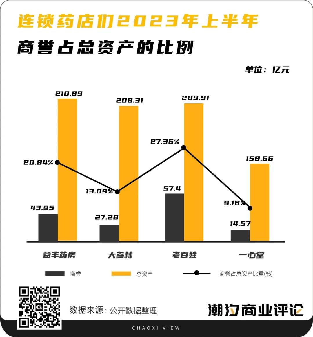 最后是急速扩张带来的高悬商誉。截至2023年上半年,益丰药房、大参林、老百姓、一心堂四家药店连锁企业的商誉分别为43.95亿元、27.28亿元、57.4亿元、14.57亿元,商誉占总资产的比例分别为20.84%、13.09%、27.36%、9.18%。