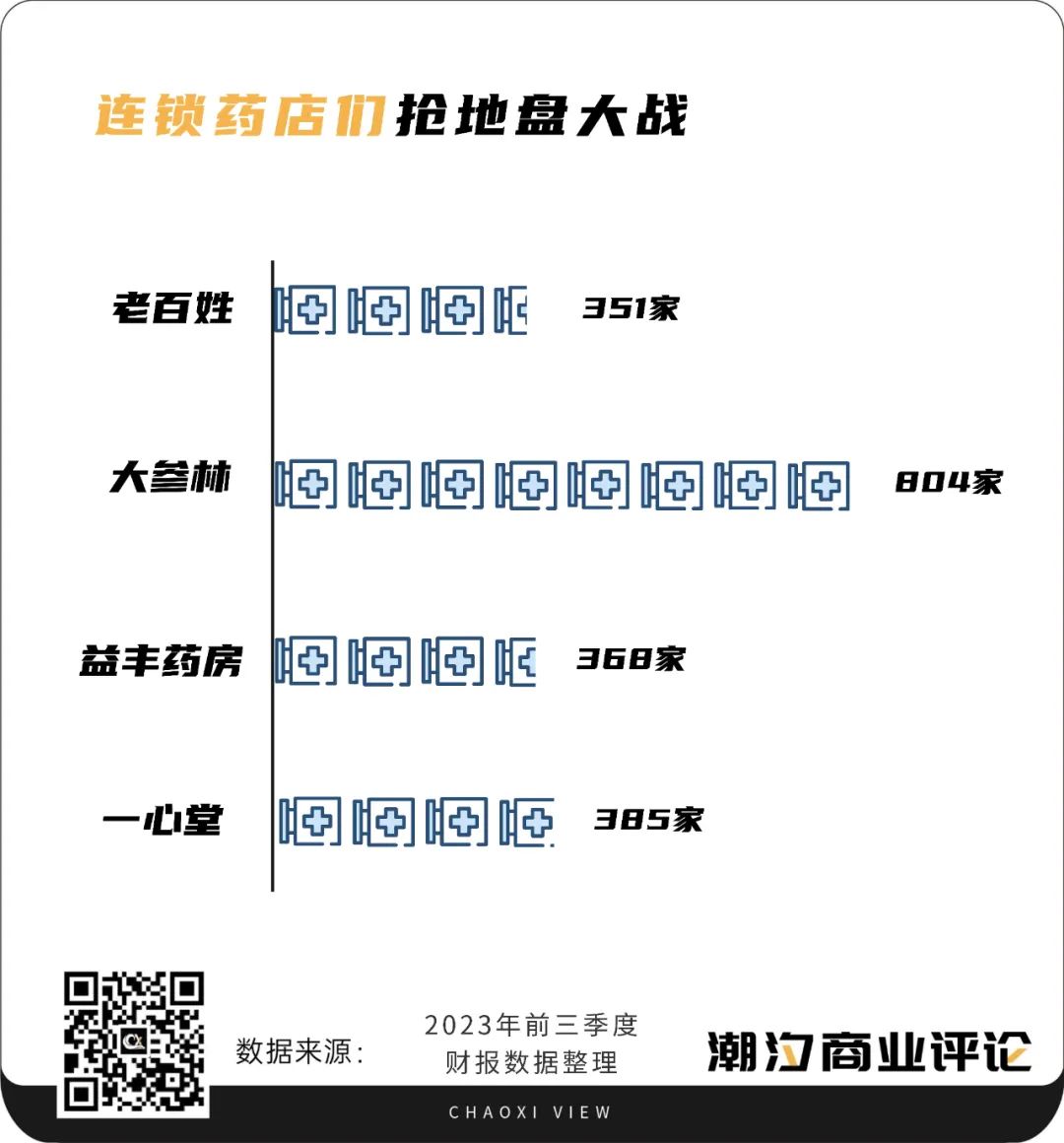 数据显示,截至2023年三季度末,四大上市连锁药房老百姓、大参林、益丰药房和一心堂的门店数量分别为13065家、12993家、12350家、10008家。