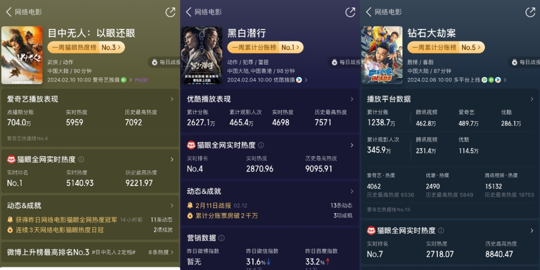 从目前的成绩来看,“爱优腾”各有出彩的作品。截至2月19日,《目中无人:以眼还眼》2月10日上线,由爱奇艺独播,点播期分账超过704万元;《黑白潜行》2月4日上线,由优酷独播,累计观影人数452.1万,累计分账2560.7万元,上线首日分账票房就达到了333.4万元。
