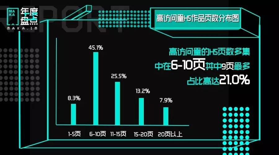 通过对访问量最高的1000个作品分析,发现高访问量的H5页数多集中在6-10页,其中9页最多,占比高达21.0%。H5虽好,可不要贪页哦~