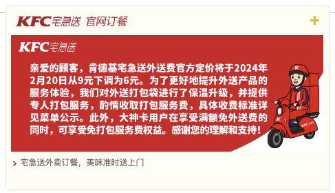 2月20日,肯德基官方网站公告,肯德基宅急送外送费官方定价将于2024年2月20日起从9元下调为6元。同时,肯德基对外送打包袋进行了保温升级,并提供专人打包服务,酌情收取打包服务费。