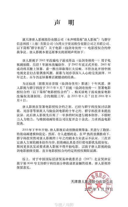 这份声明回顾了双方在《仙剑奇侠传》大电影项目上产生的纠纷过程。2013年6月7日,唐人影视与群宇科技签署了《仙剑奇侠传一》的电影授权合约,合约期限为三年,声明中称,在此期间唐人影视表示要启用胡歌、刘亦菲等原班人马赴观众的十年之约拍摄《仙剑奇侠传》大电影。然而三年过去了,电影版不仅被搁置,唐人影视与游戏方群宇科技更是产生了版权纠纷。2015年底,群宇科技以唐人影视违约在先为由,向仲裁委发起仲裁,要求解除电影授权合约。