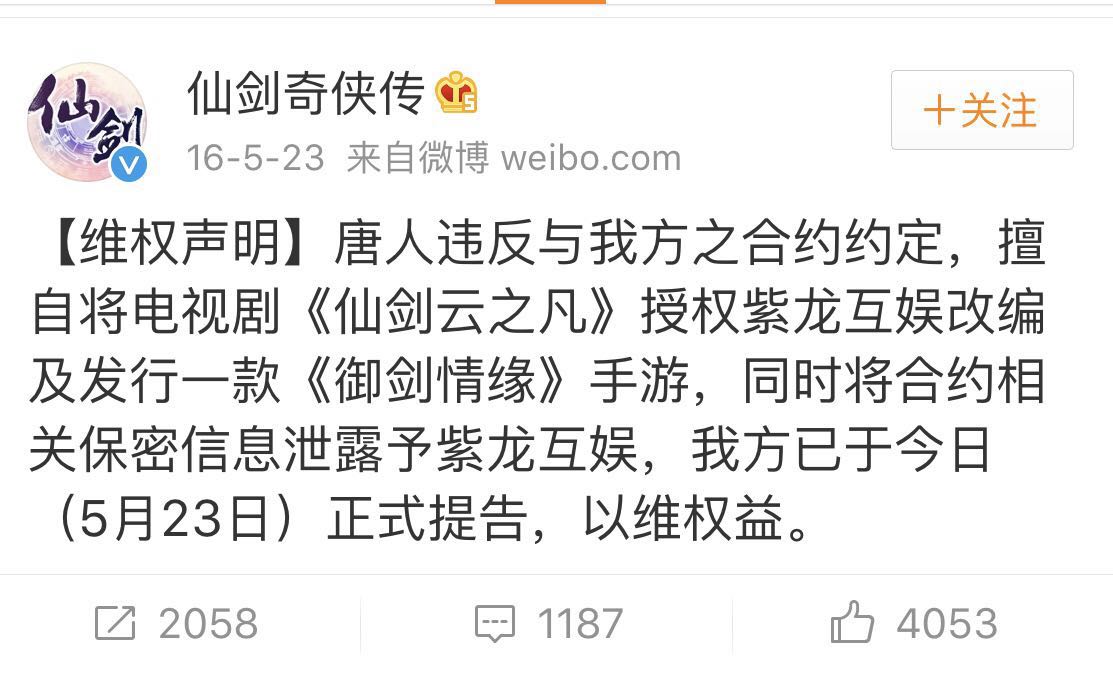 在这则微博声明的评论中,界面记者发现,很多人对这份声明并不买账。这已经是唐人影视和大宇科技之间的第二次版权纠纷了,上一次的版权纠纷还要从《仙剑奇侠传五》的版权授权说起。
