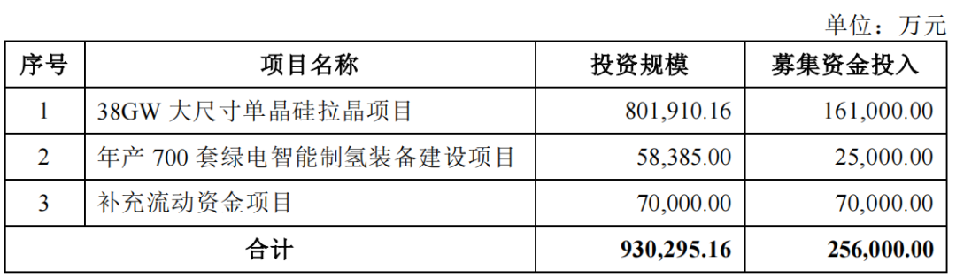 此次计划募集资金将分别用于38GW大尺寸单晶硅拉晶项目、年产700套绿电智能制氢装备建设项目和补充流动资金项目,其中用于补充流动资产金额为7亿元。
