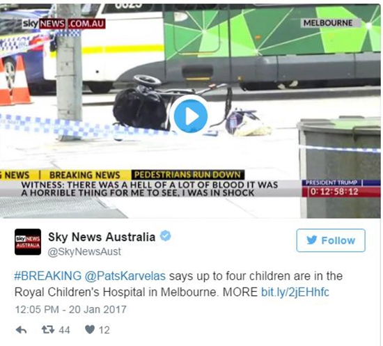 据澳大利亚第9频道报道,当地时间下午1点45分左右,一男子驾驶一辆红色小轿车从墨尔本市中心弗林德斯大街车站外疯狂驶向市中心的伯克步行街(Bourke Street),并故意加速冲撞行人。
