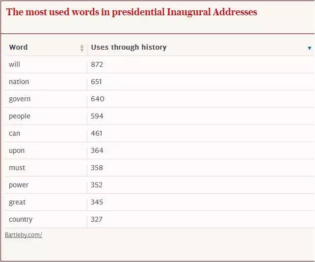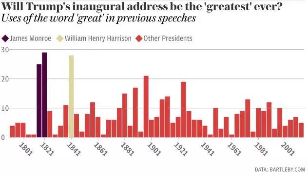 "伟大(Great)"一词在历届总统就职演讲中共出现过458次。如果特朗普想要成为最“伟大”的总统需要在这次就职演讲中提及30次才可以。目前这一记录的保持者是美国第五任总统詹姆斯·门罗在的第二任期的就职演讲中曾29次使用到“伟大”一词。