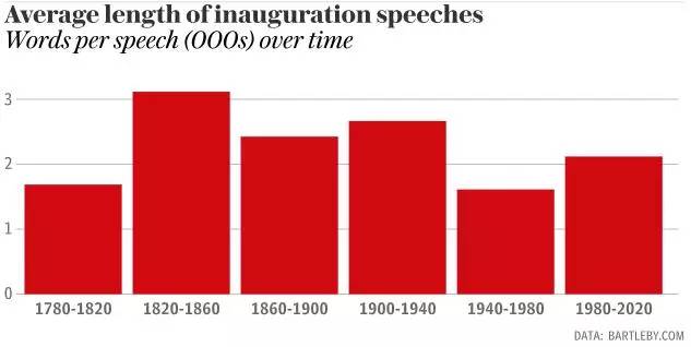 从数据中可以看出,总统就职演讲趋向于愈来愈长,1940-1980年间,总统平均发言字数为1612,华盛顿总统第二任期的135字功不可没。而1980年-2013年间,总统平均发言字数为2120,不知道特朗普总统这次是否会让这一数字有所增长。