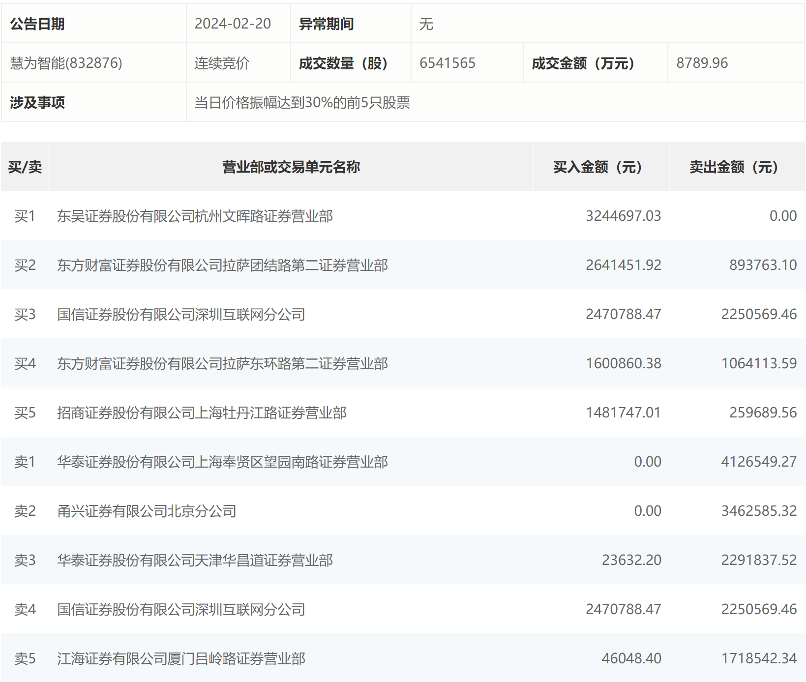 2月20日,慧为智能今日涨14.31%,龙虎榜数据显示,上榜营业部席位全天成交2757.69万元,占当日总成交金额比例为31.37%。其中,买入金额为1150.92万元,卖出金额为1606.77万元,合计净卖出455.84万元。
