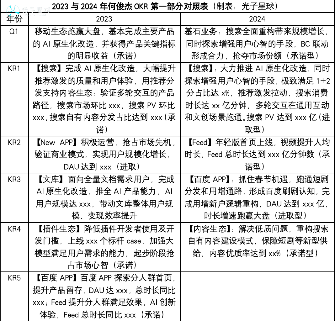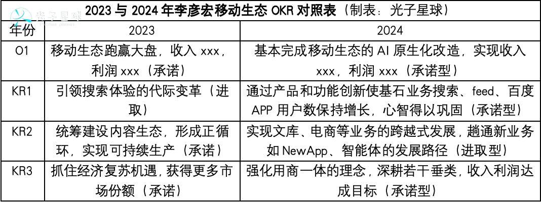 综上,百度2024年第一季度OKR呈现了诸多变化,大方向上从重构业务,转向寻求更现实的收入与利润增长。