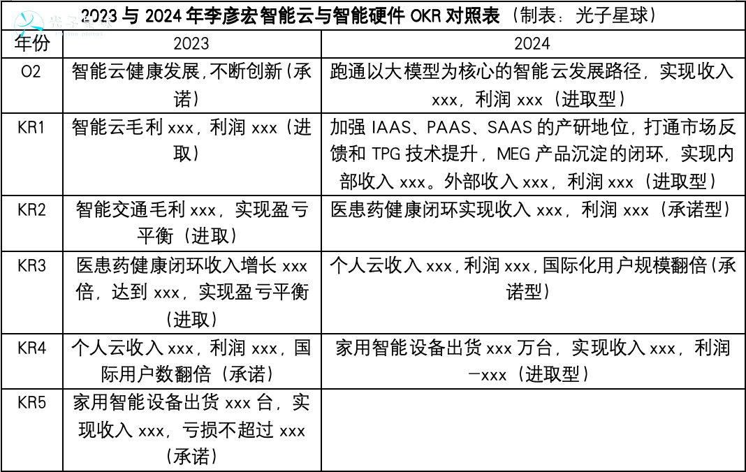 到2024年,关键词变成了“赚钱”。“利润”两个字出现在移动生态与智能云两个目标,并且7个关键成果中有5个都存在利润考核,包括内容、云计算、大健康、个人云、小度。