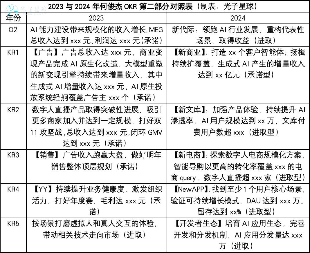 今年以前,何俊杰OKR第三部分通常会涉及到内容与服务化,鲜少直接关注利润本身。例如2022年的O3把重点放在经营效率上,去年O3则关注AIGC与内容供给,今年则因为对齐李彦宏的OKR,变为了“强化商用一体”、收入、利润等更为现实、可量化的指标。