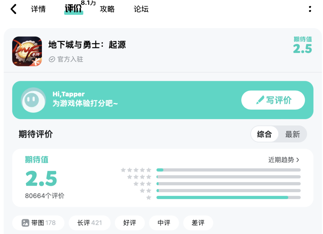 然而,《地下城与勇士:起源》在TapTap的期待值8万+玩家评出2.5,有大量1星评论。B站更惨,8.9万玩家评出2.2分。低分主要是一再延期、进度缓慢问题,也有“不如韩服”、删改较多等因素。