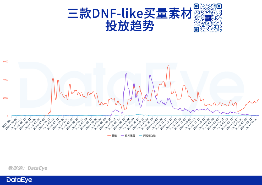 DataEye-ADX数据显示,《晶核》《战斗法则》《阿拉德之怒》三款游戏去年6月以来买量素材投放趋势如下: