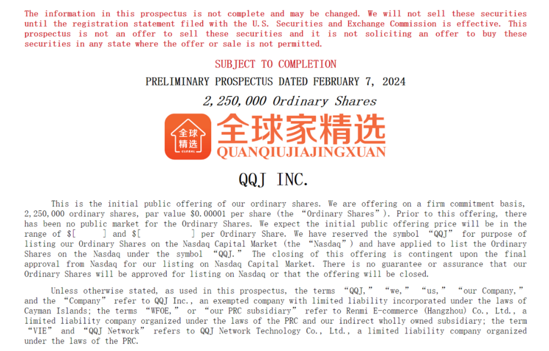 近日,仁弥(杭州)网络科技有限公司(以下简称“仁弥科技”)的开曼控股公司QQJ Inc.向SEC(美国证券交易委员会)递交了招股书,拟在纳斯达克IPO上市,股票代码“QQJ”。