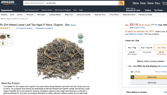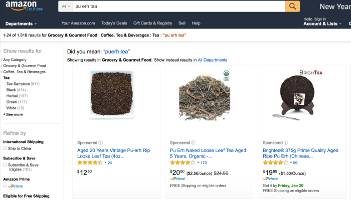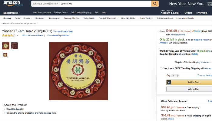 前段时间,关于“马应龙”和“老干妈”横扫美国亚马逊购物网、让老美疯狂的网文,赚得网友笑声无数。当我们试着在亚马逊搜索“pu-erh”(普洱茶)的时候,才陡然发现,原来在这个“美国淘宝”上,关于普洱茶的搜索记录其实已多达2000多条,多款普洱茶的评分都高达4.5分,而关于普洱茶的五星好评更是有上千条,大有赶超绿茶、乌龙茶在国外影响力的势头。
