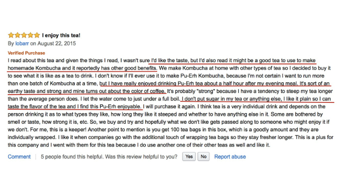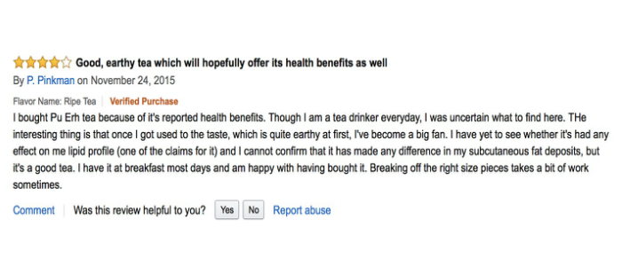 红线处翻译:刚开始我不确定自己是否喜欢普洱茶的味道,但我打算买普洱茶来做家用茶酵素,因为听说用它做茶酵素有很多健康的益处。……但当我试过普洱茶以后,发现居然普洱茶这么好喝,我现在每天晚餐后都得来一杯。普洱茶的味道有一种质朴但又醇厚的感觉,而且汤色像咖啡一般…… 我喝普洱不加糖和其他东西,因为普洱本来的味道就十分迷人,我会再次购买普洱茶的。