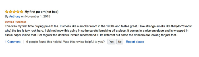 翻译:这是我第一次买普洱茶。它闻起来像是上世纪60年代的吸烟室,但喝起来味道好极了。我就喜欢奇奇怪怪的味道(我也不知道为什么)。这茶饼就像石头一样硬,所 以在切茶饼的时候要小心。它用手纸一样的包装袋包着,放在一个挺漂亮的信封里。对于习惯喝茶的人来说,我很推荐这款茶。它的味道很特别,但正适合那些喜欢 奇怪味道的茶客们。