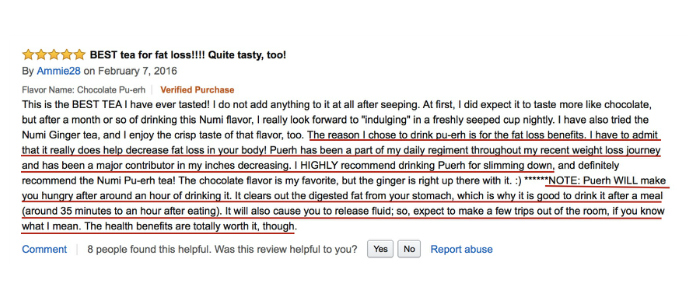 红线处翻译:我开始喝普洱茶的原因是为了减肥。必须承认它的确能帮我减去体内的脂肪。普洱茶已经成为我减肥道路上的忠实小伙伴,帮助我成功减下去了好几寸的腰围啦!我超级推荐喝普洱茶来减肥!…… 友情提示:喝完普洱茶会让人觉得很饿,因为它可以清除你胃里的油腻,所以饭后35分钟之后喝一杯普洱茶非常有益。它也有利尿的效果,所以它能帮助你站起来走动走动,多跑几次厕所。总之,普洱茶的确有非常好的健康作用。