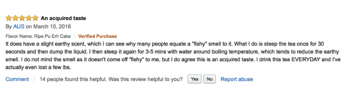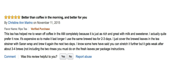 翻译:我从来都不是热衷发表茶评的人,但我这次不得不说,我实在是太喜欢普洱茶了,颜色、香气,味道都太迷人了!在我印象中,很少有这样的茶,既具有健康的作用,又如此好喝。不管是热饮,还是冷泡,味道都很好!