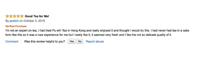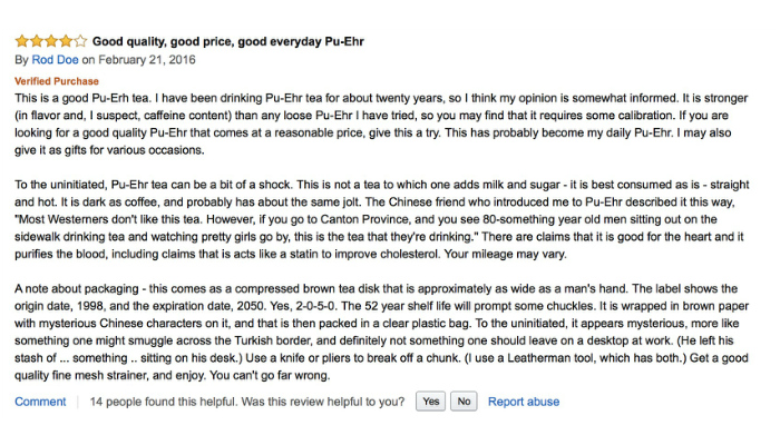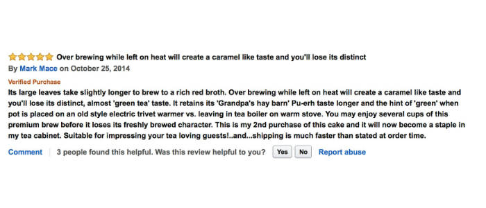 翻译:这是一款很好的普洱茶。我已经喝了大概20年的普洱茶,所以我认为我还是了解一点门道的。这是我试过的普洱中味道最浓的(我认为在咖啡因含量方面也是最大的),所以也许你会发现需要去稍微适应一下这款茶。如果你正在找一款性价比高的普洱茶,那么就试一下这款吧。这已经变成了我的日常饮茶。在有些场合,我也会用它来当做礼物送人。