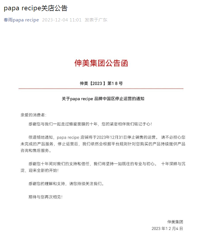 典型如春雨。春雨是一家韩国品牌,主营面膜、水乳等护肤品,产品售价89-200元,曾经一年卖出11亿片面膜、近90%销量集中在中国市场。2023年12月31日,春雨暂停了中国区的运营,或关闭或清空此前在天猫、京东和抖音等平台的店铺。