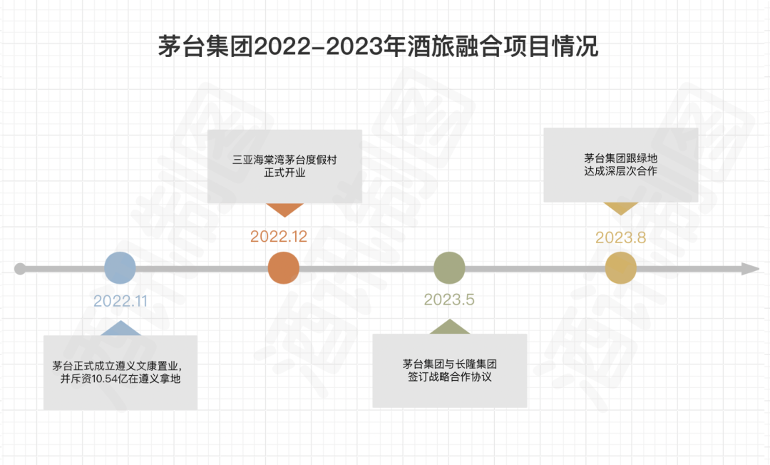 2023年8月,茅台集团跟绿地达成深层次合作。同年5月,茅台集团与长隆集团签订战略合作协议。2022年12月29日,三亚海棠湾茅台度假村正式开业。当年11月,茅台正式成立遵义文康置业,并斥资10.54亿在遵义拿地。2022年以来,仅茅台文创产品就实现产值近6亿元,营收同比增长586%,利润同比增长629%。