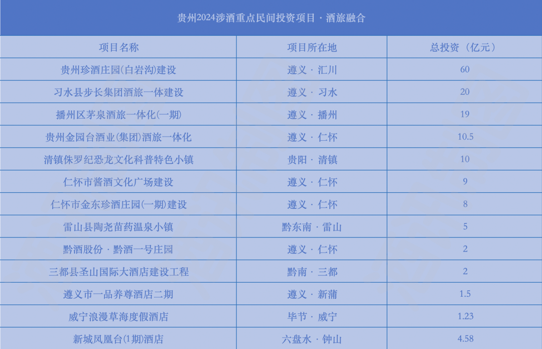 产区抱团发展离不开各地政策支持。2024年开年,贵州省发展改革委发布《关于大力推进2024年2000个重点民间投资项目的通知(黔发改投资〔2024〕45号)》,向社会公布2024年2000个重点民间投资项目。其中,有107个项目涉及酒业,酒旅融合项目达12个,涉及珍酒庄园、步长集团酒旅一体等项目。此外,《四川省建设世界重要旅游目的地规划(2023—2035年)》《亳州市华夏酒城建设三年实施规划》等推动白酒与旅游深度融合发展。