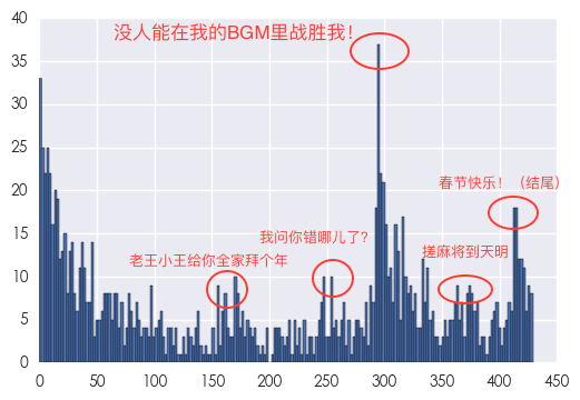 “老王小王给你全家拜个年”:隔壁老王(在弹幕中的出现概率为0.86%)的威慑力还是很强的,另外估计还要王健林(在弹幕中的出现概率为0.13%)的小目标加上王思聪(在弹幕中的出现概率为0.07%)的国民老公在挑逗观众的情绪