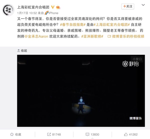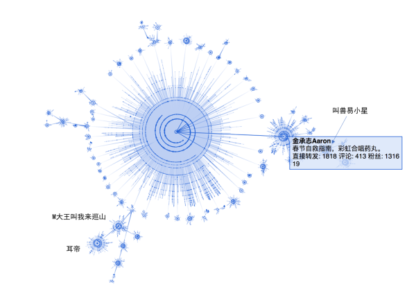 从微博的传播路径来看,始于上海彩虹室内合唱团的官微,按照比较平均的爆破速度传播出去,其中存在两个关键性的二次传播节点:金承志和M大王叫我来巡山。同时金承志影响了大V叫兽易小星造成第三次传播,M大王叫我来巡山影响了耳帝造成第三次传播。