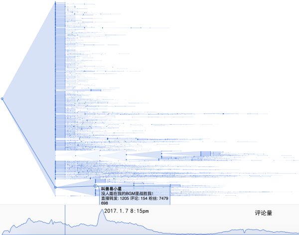从传播强度来看(下图是各个时点的评论密度),在下午4点左右达到第一高峰,在下午8点左右达到最高峰。评论的内容大都比较乏味:哈哈哈、转发等等。稍微有些营养的评论往往也只是重复歌词:BGM、战胜、春节等。