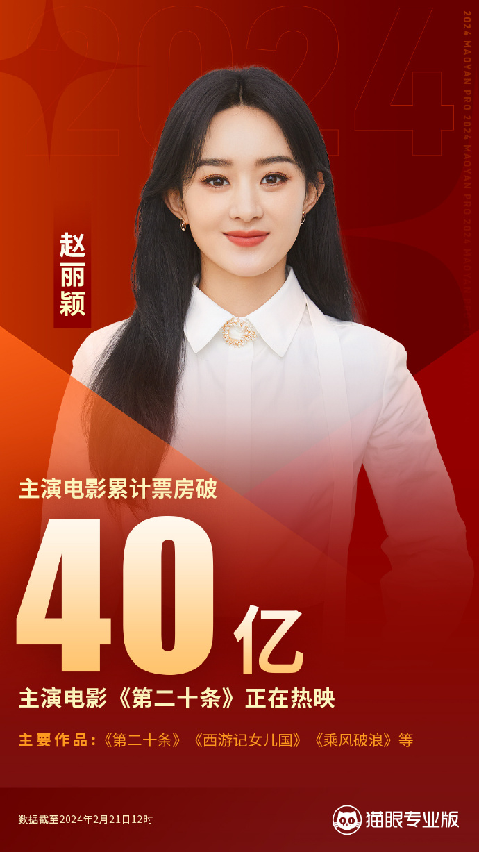 据猫眼专业版数据,2024年2月21日12时,赵丽颖主演电影《第二十条》正在热映,助力赵丽颖主演电影票房破40亿。