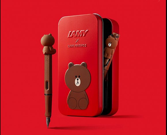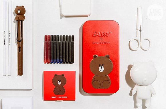 最后一个是LINE 周边产品,LINE FRIENDS 过去一年火的不行,成为千禧一代的夯货,国内仅有的店铺动不动就排队,如果能带回去给表妹应该也是倍儿有面子。推荐 LINE FRIENDS x LAMY 联名款的文具,红色的套装很适合新年,包含常规的一支 LAMY 钢笔、吸墨管和一支一次性水芯外,还有两个可以套进笔盖做装饰的布朗熊。售价约 400 元人民币。