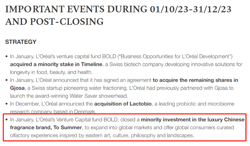 这是过去60年间欧莱雅集团首次在年报中官宣少数股权投资事件。欧莱雅集团首席全球增长官费博瑞表示:“此次对于观夏的投资是欧莱雅集团2023年在北亚市场最重要的投资之一。”