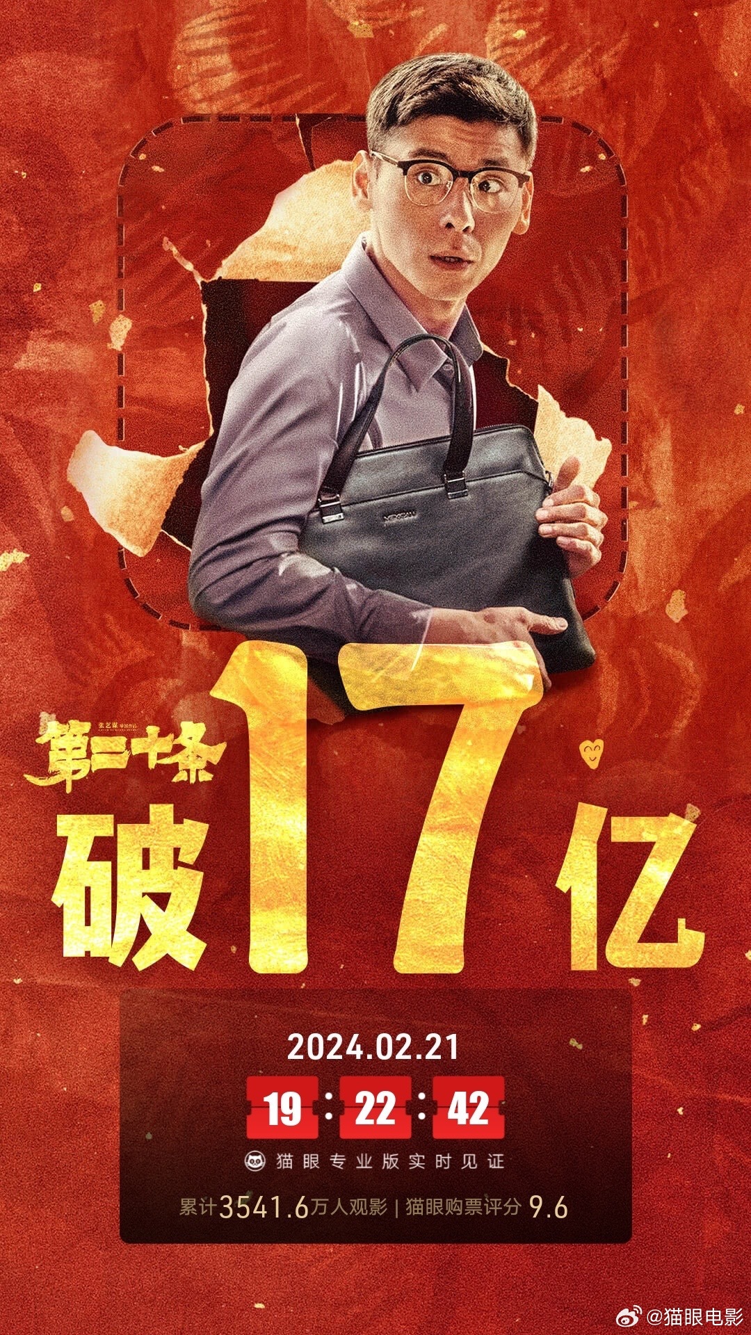 据猫眼专业版数据,电影《第二十条》 上映12天 ,总票房破17亿。