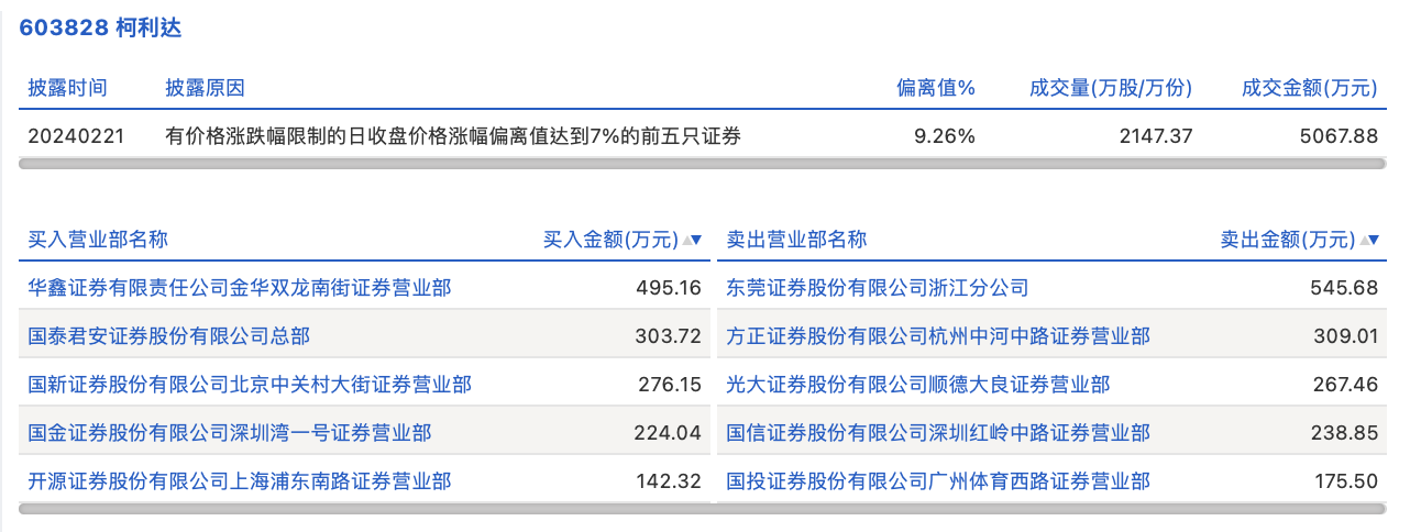 具体来看,华鑫证券金华双龙南街证券营业部、国泰君安证券总部分别买入495.16万元、303.72万元;东莞证券浙江分公司、方正证券杭州中河中路证券营业部分别卖出545.68万元、309.01万元。