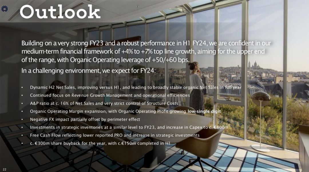 他继续指出,保乐力加对于战略库存的投资水平将与2023财年基本持平,本财年的资本支出将增加至约8亿欧元。自由现金流预计将反映持续经营业务报告利润的下降以及我们战略投资的增加。最后,预计股票回购金额约为3亿欧元,这在上半财年已完成一半。