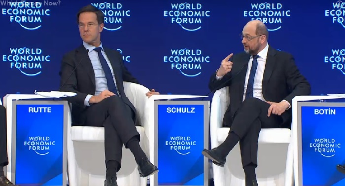 总之,知道欧盟的问题出在哪了吧。达沃斯的这场辩论中,四名嘉宾的背景分别代表了欧盟经济内部的不同角色,欧盟官员、欧洲议会成员、欧盟成员国政府官员和银行家都被包括在内。这四个人同台并未给“欧洲的未来”(这也是会议主题)拿出一个有说服力的方案,反而吵得不可开交。欧洲议会议长舒尔茨与荷兰首相吕特的辩论几乎可以用“鸡同鸭讲”来形容。在达沃斯会议上况且这样,又怎能指望他们所代表的机构解决欧盟的问题呢?
