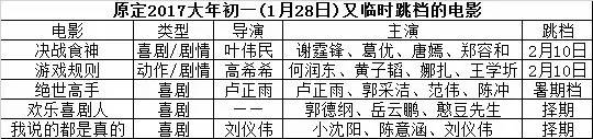 今年,先后有12部电影宣布定档1月28日大年初一,历年之最。可临近上映,有五部又陆续跳档,包括谢霆锋、葛优主演的《决战食神》,郭德纲、岳云鹏的综艺电影《欢乐喜剧人》,刘仪伟的喜剧新片《我说的都是真的》,何润东、黄子韬主演的动作片《游戏规则》,以及新人导演卢正雨执导,郭采洁、范伟主演的喜剧《绝世高手》。