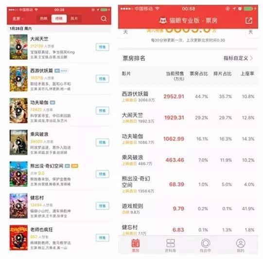 在猫眼上,《大闹天竺》打广告以12.9元起搞特惠,《西游伏妖篇》搞17.9元起超前抢票。