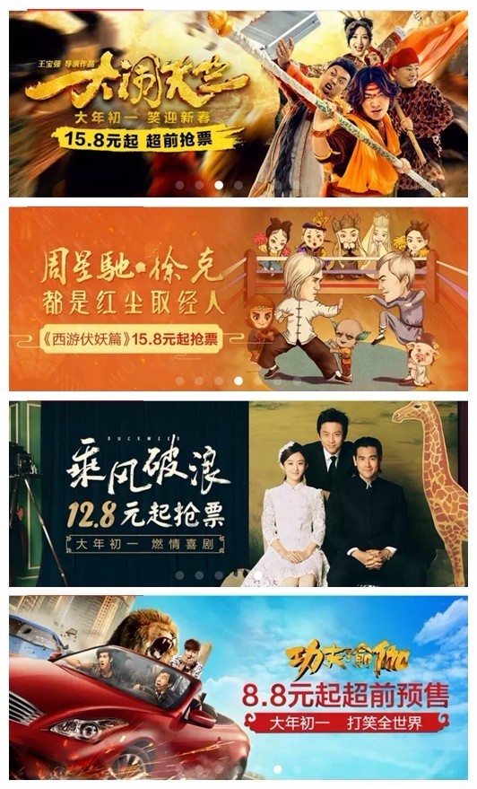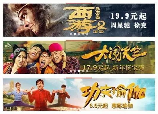 在淘票票上,《西游伏妖篇》、《大闹天竺》分别以15.8元起打广告抢购,《乘风破浪》以12.8元起打广告抢购,《功夫瑜伽》的抢购价低至8.8元。